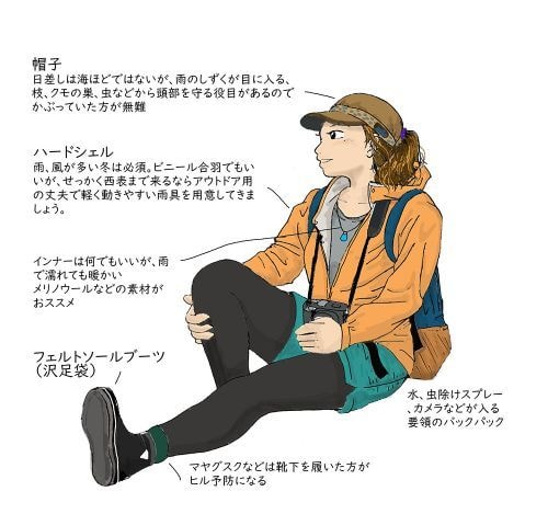 | 上半身 | シャツを重ね着してレイヤード メリノウールなど濡れても温かい素材が◎ 雨が多いのでハードシェル(レインウェア)は忘れずに。多少はレンタル可能です。 |