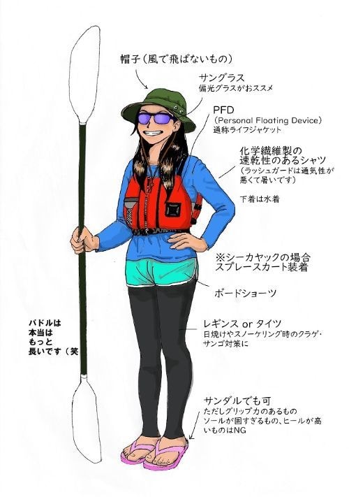 | 上半身 | PFDの着用 ラッシュガードやシャツの着用はなるべくしてください。ラッシュガードはフード付きが便利です。 ウエットスーツを持参の方は着用をおすすめします |