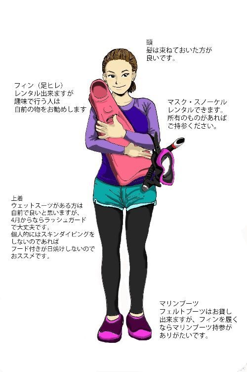 水着だけのスノーケリング、スキンダイビングは当店では基本行いませんのでご了承ください。
