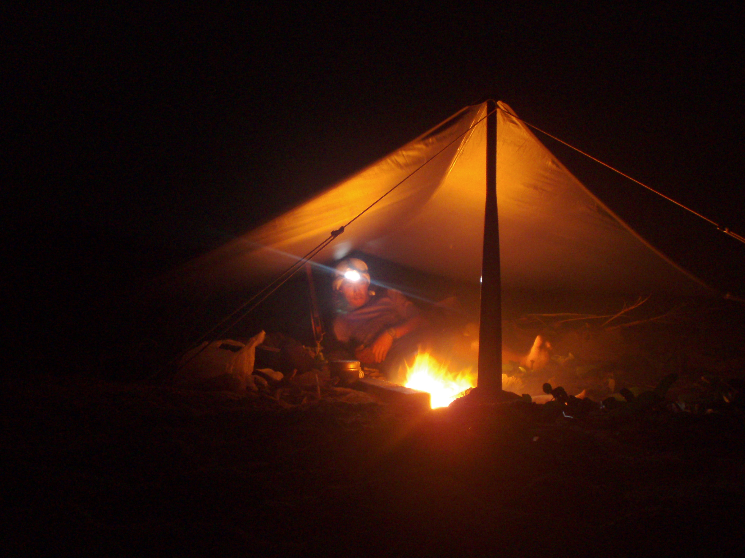 テントを張り、窪地にタープを張って、その中で焚火を起こした。濡れた流木を乾かしながら焚火にくべると、なかなかの移住空間となった。