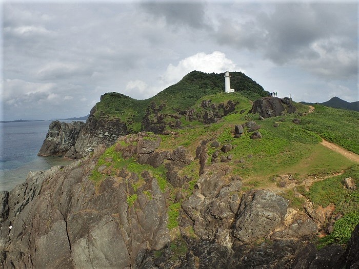 石垣島最北端である平久保崎は崖に囲まれていて、上の部分は風が強すぎるためか大きな木は生えることなくほぼアダンに覆われており、今はところどころ牧草地になっている。だから白い灯台が周り込む前から見え始めていた。