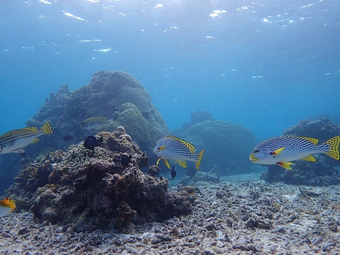 しかしその帰り道、なかなか深くて広いイノーに出くわし、そこのハマサンゴの大きな根が漁礁になっていて多くの魚が群れていた。透明度も良く、魚も擦れていないのでやっと石垣島で魚に癒されることになった。もう一匹追加してビーチに戻る。