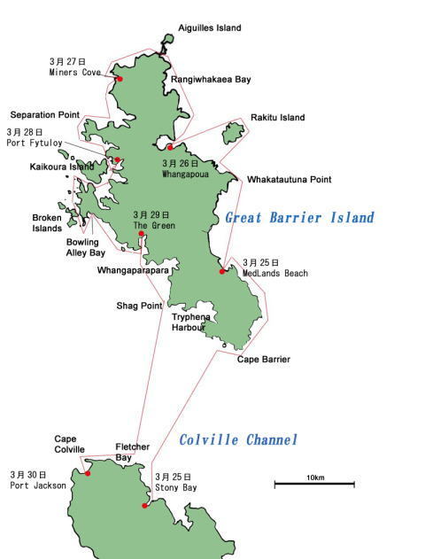 オークランドに所属するその島は、南海の海流の影響を受けて非常に温暖な気候を持ち、開発から免れて自然が多く残っているという。島の形といい地図で見てもカヤック、潜り共に最高の場所だと考えていた。オークランドシティからフェリーもしくは飛行機で行くのが一般的だが、コロマンデル半島の先端からなら直線でわずか20kmほどの距離だ。今回の沿岸の旅において、もっとも有意義な寄り道先として僕はこの島に行くのを楽しみにしていた。