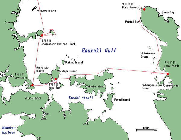 8時45分出発。今日はコロマンデル半島を離れ、ハウラキガルフを島々を転々としつつ横断する予定だ。途中、15kmほどの海峡横断もある。