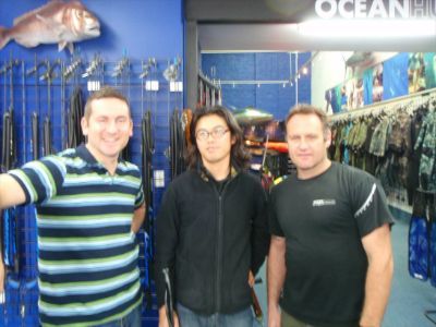 僕はオークランドシティに長いこと居たのでこの地にあるショップ「Ocean Hunter」をよく利用していた。日本ではまず考えられない魚突き専門ショップで、水中銃からウエットスーツ、ロングフィンなどが手に入る。ショップのスタッフも毎週のように海に行って魚突きを楽しんでいるのでその情報量はハンパない。日本の釣り具屋のような感覚で魚突きをポイントなどを教えてもらえる。僕が行った時などはパソコンでグーグルアースを開き、それを見ながら詳細なポイントを説明してもらい、プリントアウトまでしてくれた。常連だったので道具の購入の際には色々とサービスもしてくれて非常に良心的である。この国で魚突きをやりたい方、やってみたい方は是非訪ねてみてください。
