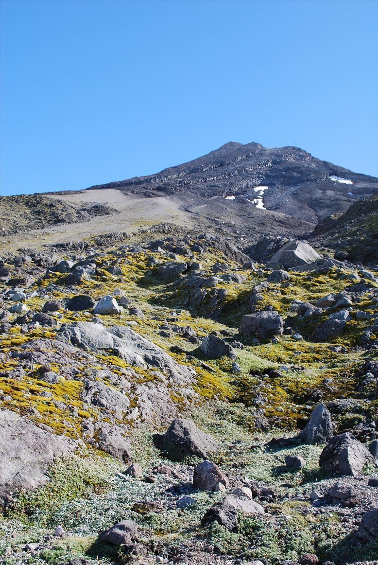 その階段がやっと終わると、森林限界はとっくに過ぎて、灌木や草はもちろん、苔すらも生えない岩礁地帯となる。富士山に登ったことはないのだが、富士山の8合目あたりもこんな感じなのかな…と思う荒涼とした風景が目の前と眼下に続き、軽石の砂利が歩いていてフワフワした感じを受ける。