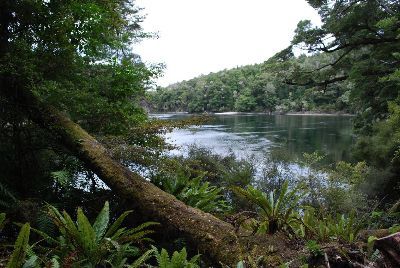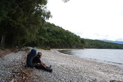 体が冷えると逆に良くないし、休憩すると勢いがなくなって気持ちが途切れがちなので30分ほどで出発する。すぐに最後の山小屋、Shallow Bay Hutに行く分かれ道に出たが、迷わずレインボーリーチへ。この小屋は予約がなくてもハットパスがあれば泊まれるようだ。釣りでもするには良いところだが、今回はもう寄り道すらする気になれない。