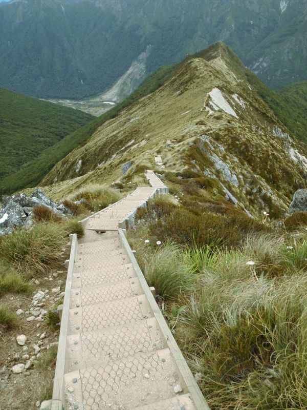 それでもなんとか森林限界に10時には出ることができた。山に登る時、森林限界を超える時はなかなか興奮する瞬間の一つだ。下界から天上界に移る境界線のようにも思える。ケプラートラックもそれは同じく、一気に開けた山の稜線上を木製のタラップがかけてあり、そこを歩いていると空の上を歩いているようだ。右手にはテアナウ湖が湖面に太陽光を反射させている。絶景だ。