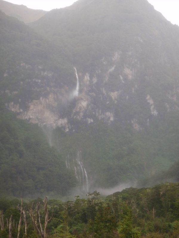 しばらくは森の中を歩いているが、40分ほどで開けた河原に出る。氷河によって削られた山肌に、雨が降った時しかできないだろう滝が何本もできていて、上空は風があるのかなびいて霧になっている。その高低差はなかなかの迫力がある。