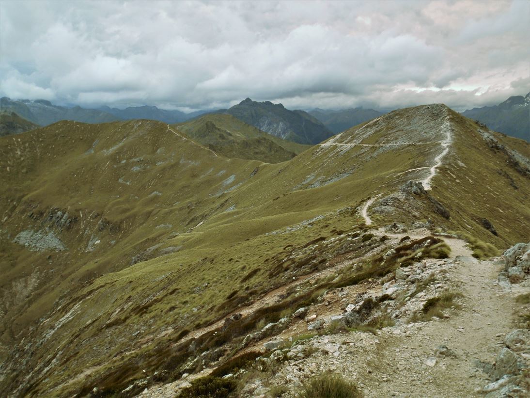 このシェルターから次のハンギン・バレーシェルターまでは細い稜線上を進むことになる。ところが不思議なことにこの辺は風があるにはあるが殺人的ではなく、スムーズに足を運ぶことができる。その景色のよさもあり、ややテンションを揚げて歩いた。ある意味、このあたりがケプラートラックのケプラートラックたる場所だろう。空の上を歩く様な素晴らしいトラックだ。