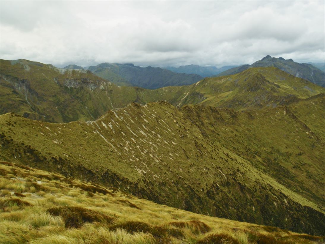 ここからハンギン・バレーシェルターまではとにかく風との戦いだった。あまりの風の強さの為に行くかどうか考えたが、どうも皆さん歩いてはいるようだ。地を這うようにしてじりじりと歩いて行くことに。 高低差はそれほどでもなくなったが、上りであることには変わりなく、しかも風がべらぼうに強くて足の裏の全体で体重を支えないといけない。山の斜面を歩いて行く時はいいが、コルに出て左右なだらかに落ちて行く不安定な稜線を歩かなければいけない時は吹っ飛ばされるのではないかと心配になった。このトレイルの最高地点、Mt.Luxmoreの頂上にはあまりの風で登頂を諦めた。山の経験がそれほどない僕にはなかなかの試練である。フォレストバーン・ハットが見えた時は正直ほっとした。