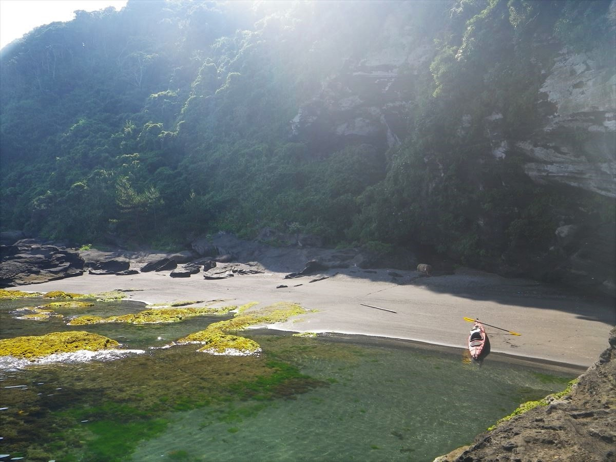 潮の荒い場所を漕ぎ抜け、やや安全な場所に来てから見てみると、トビウオの尻から卵が漏れており、どうやら産卵のために藻場に集まって来ていたようだ。体長30センチほどのアヤトビウオ。胸鰭に模様があるきれいな奴だ。すこしホクホクした気持ちで目の前にある根本の砂浜に16時ちょうど、上陸した。